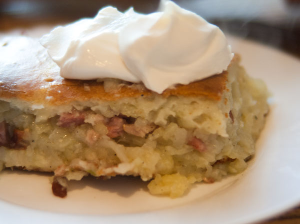 Подавать пирог обязательно со сметаной. На крайний случай – запивать молоком. Это вкусно. Когда я была начинающая совсем домохозяйка, готовила этот пирог очень часто, с разными начинками (но самая простая картофельно-луковая самая вкусная); в последнее время что-то подзабыла этот пирог.