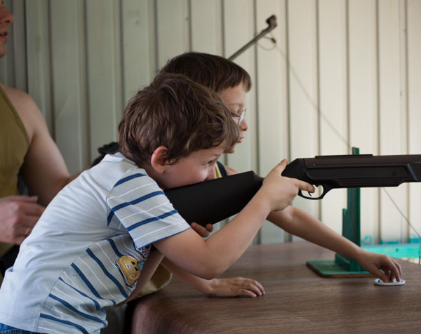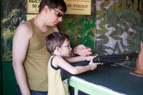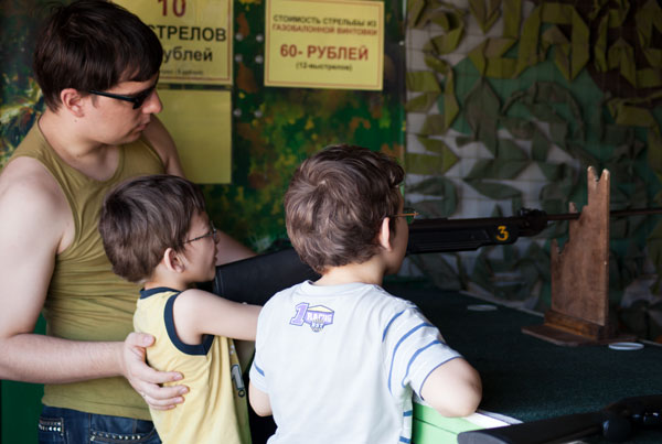 На пути – три тира, пройти мимо невозможно. Папа заряжает, дети стреляют.
