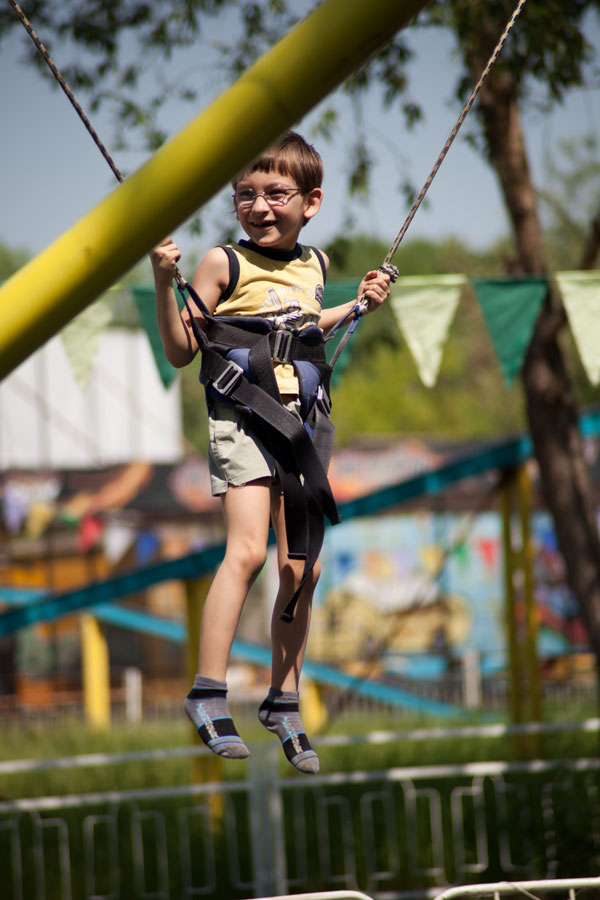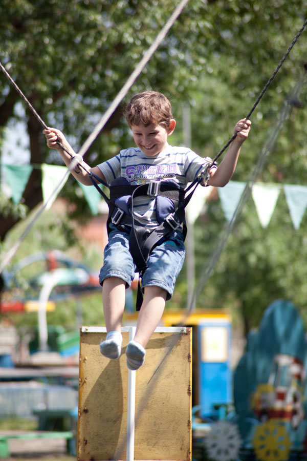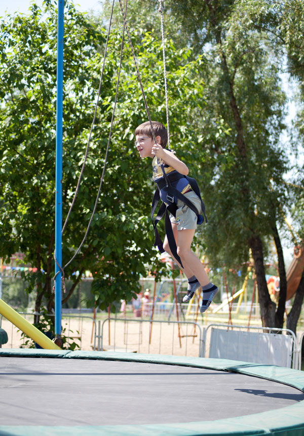 Тот же батут, вид сбоку. Аттракцион “Кенгуру”. Общий вид: батут, ребенок привязан на пружинах-резинках. Поэтому прыжки получаются высокие-высокие! К сожалению, кульбиты и перевороты запрещены, хотя, по-моему, в этом самый сок аттракциона.