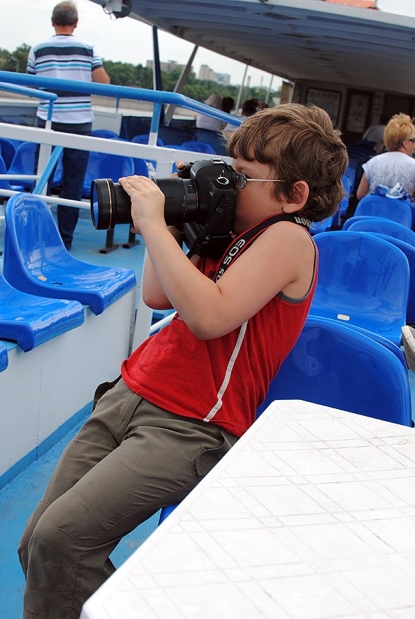На борту был такой специальный бинокль. В него надо опускать монетку и можно разглядывать 5 минут берега. Дети очень прибором заинтересовались. Сначала дети даже хотели тратить на бинокль свои монетки. Но аппарат детские деньги сожрал, а берега не показал. Вот было горе! Со второго раза получилось (правда, на вторую попытку дети деньги таки выклянчили, свои тратить не стали). Дети посмотрели в бинокль. Развлечение им понравилось средне. А вот прибор сам по себе понравился. Поэтому Антон каждый раз, когда пробегал мимо бинокля, в него заглядывал (конечно, ничего там не видел). И вот Антон смотрит в слепой бинокль. К нему подходит мальчик постарше: – Ты глупый! Надо сначала денежку вставить, а потом смотреть. – Раз ты такой умный, вставь денежку, а я смотреть буду.