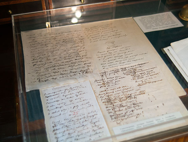 Вход через подвал. На первом этаже – разные вещи Пушкина. Прижизненные издания, рукописи. Почему-то все комнаты оформлены как кабинеты. ))