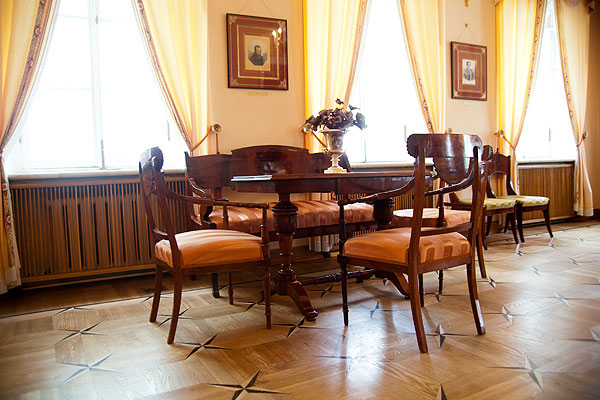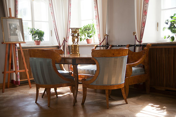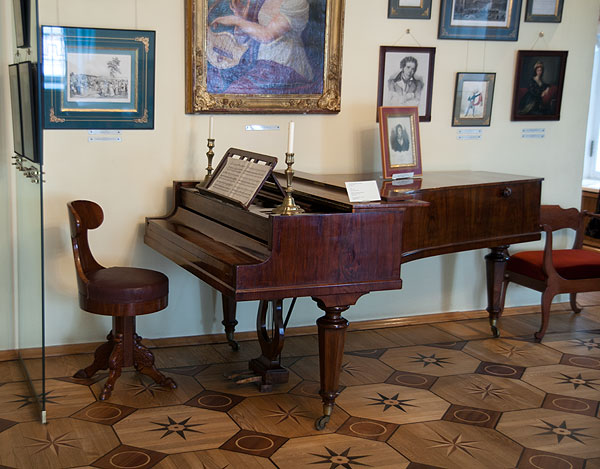 Вобще, Пушкин этот дом на Арбате снимал, когда он съехал, хозяева все переставили по-своему, сдавали дом кому-то еще. Поэтому какое отношение интерьеры имеют к Александру Сергеичу – не очень ясно. Просто что-то по мотивам того века. Жаль, конечно, но все равно интересно.