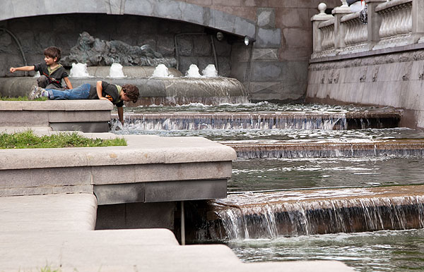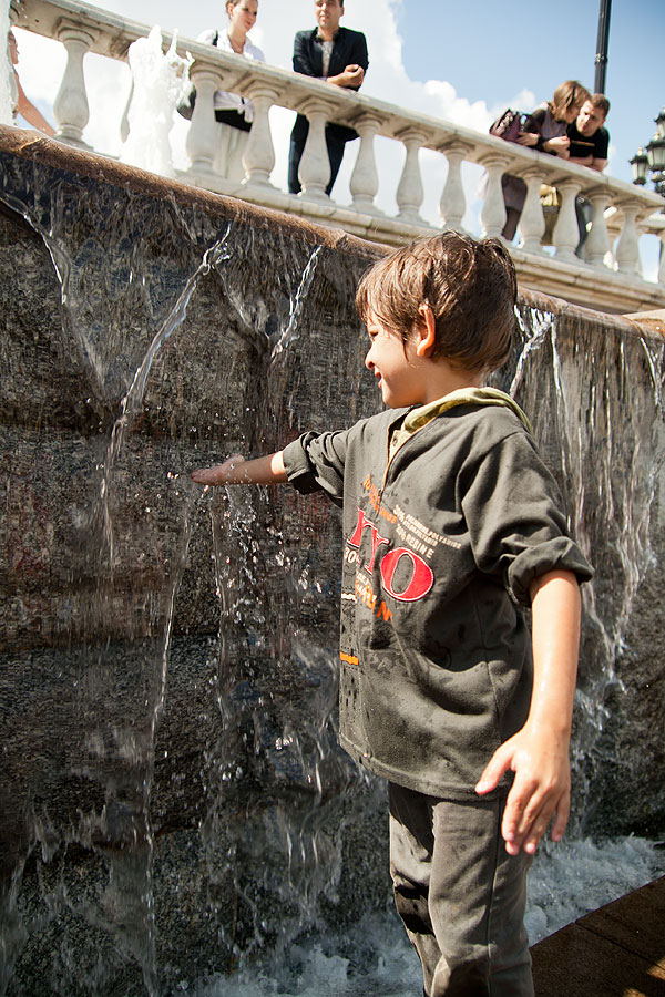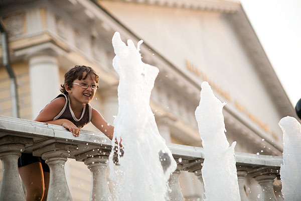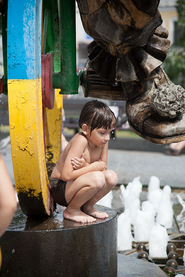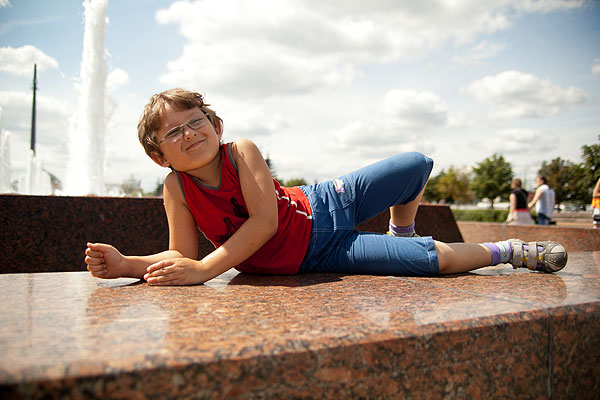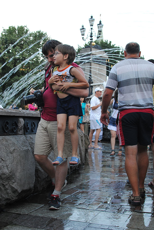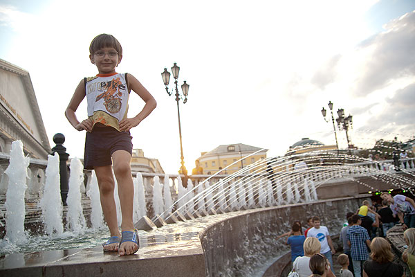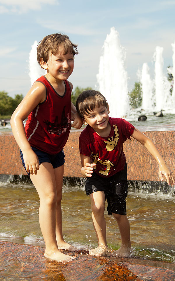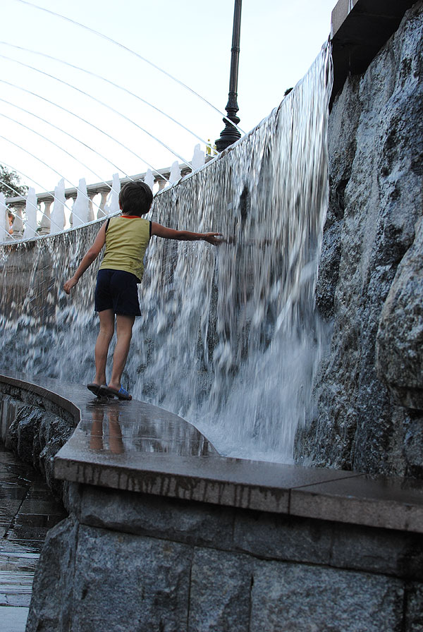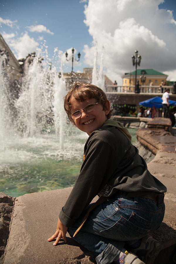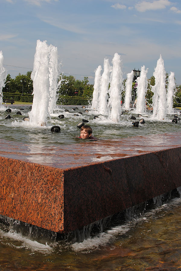 С детьми было очень просто находить себе местечко поудобнее. Антон подходил к фонтану, совал туда руку и зажимал ладошкой форсунку. Естественно, брызги во все стороны, и люди, ранее сидящие на фонтане, разбегались куда глаза глядят.