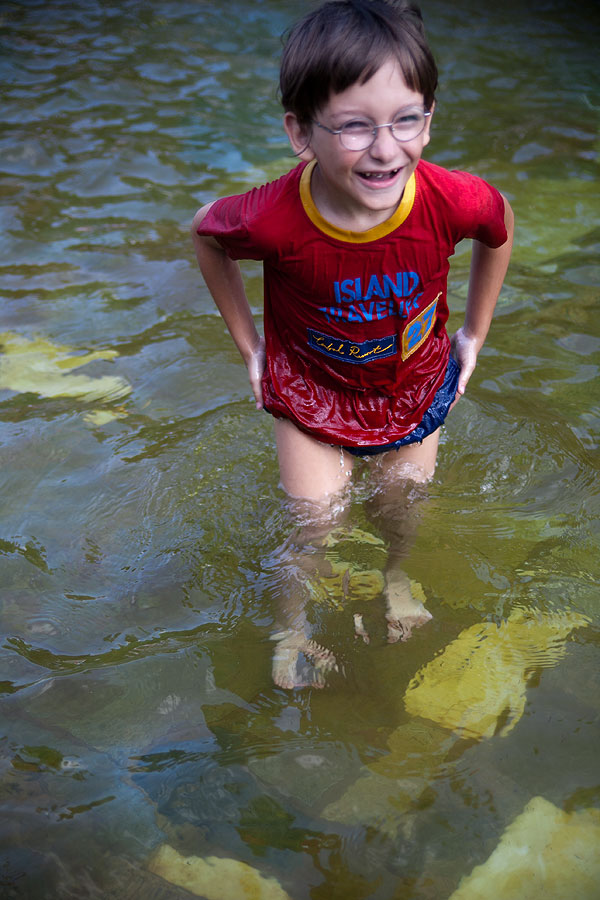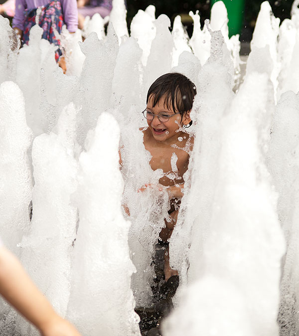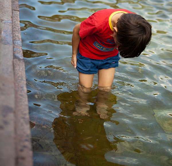Антон был счастлив! Раз уже мокрый, можно было в воде бегать, прыгать и сидеть. Если присмотреться было к предыдущим постам, видно, что в Музее современного искусства Антон уже бегает не в своей одежде, а в папиной футбоке.