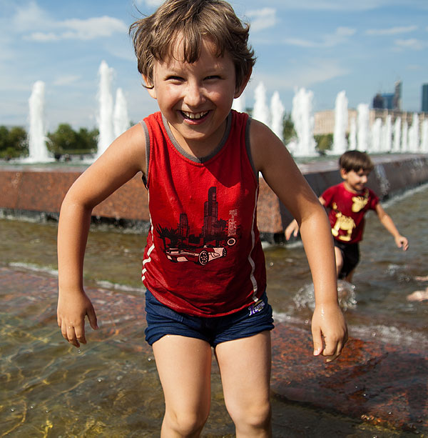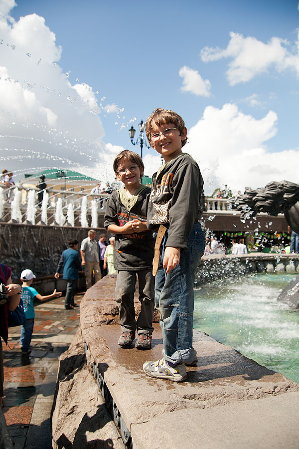 Вот это, наверное, был самый детский счастливый день в Москве. В фонтане они мокли больше часа (к счастью, на улице было очень жарко, +28). Но все равно, после полутора часов в фонтане, было примерно так: