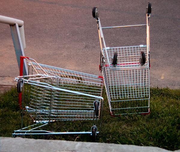 Например: какая может быть причина так кинуть тележку? А вдруг покупателя украли прямо с парковки? Запихали в черный джип – а тележку оттолкнули!