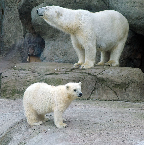 Белые медведи не в открытой клетне, но за стеклом, а не за сеткой. Поэтому фотографировать их намного удобнее.