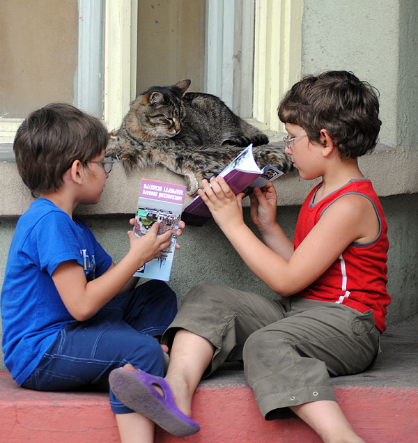 Возле домика какой-то администрации уже у самого выхода бегал кот. Дети решили, что это знак свыше, надо пойти, коту все рассказать: и какие крутые обезьяны, и что леопарда мы так и не нашли. Для пущей наглядности коту все объясняют с картой: