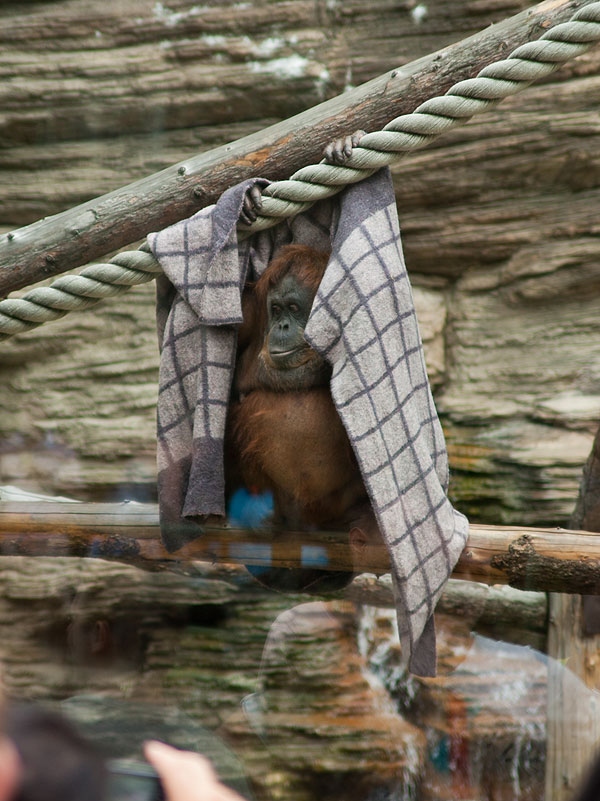 А вот эта обезьяна взяла одеяло и укрылась от накрапывающего дождика: