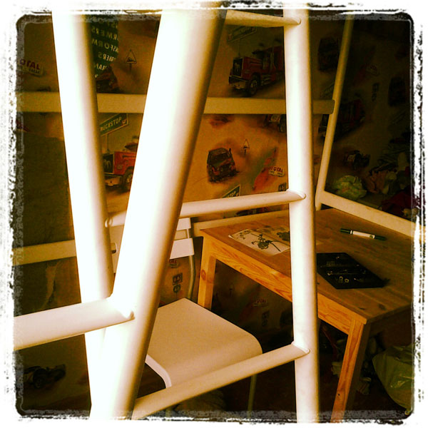 Полгода назад, на день рождения детям мы купили кровати-чердаки. Это уже к школе. Детская у нас 7 кв.м. Чтобы на эту территорию влезли 2 кровати, 2 стола, 2 стула и комод для одежды, кровати-чердаки – просто необходимая ведь! И турник спортивный заменяют на ура. )) Плюс под кровати перекочевала школьная доска.