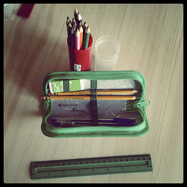 Вот, кстати, пенал вобще хотела взять такой пластмассовый, как цветные карандаши стоят. Мне в детстве такой был удобнее всего. Стоит 6 рублей. Но что-то меня остановило, купила пеналы по-современнее, хоть и действительно аскетичные.