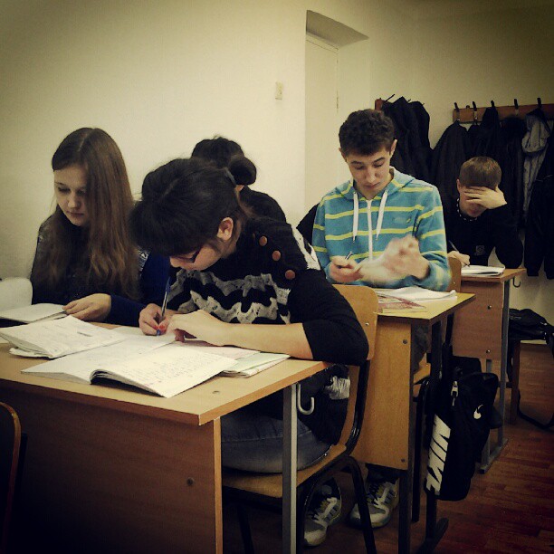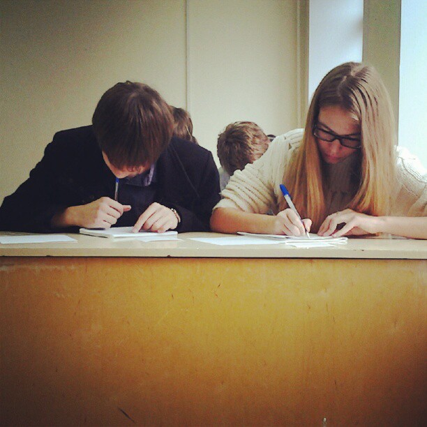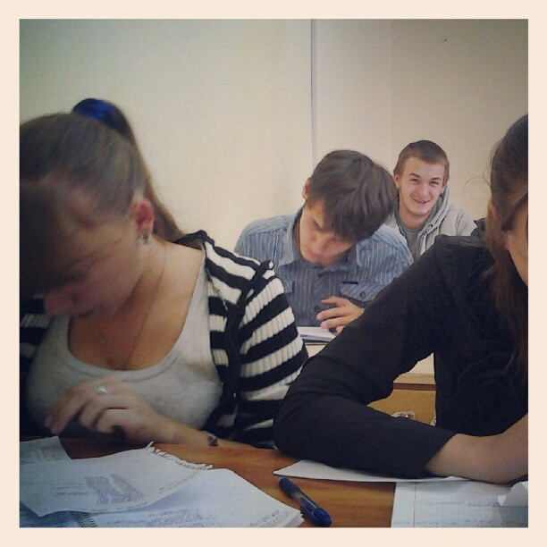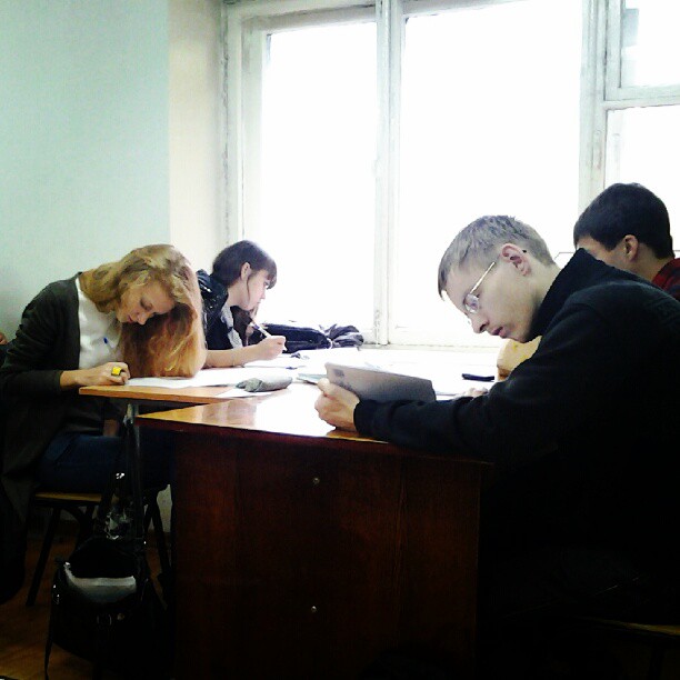 Одну группу посадили в такую аудиторию, где мы не влазим. Поэтому свой преподский стол пришлось уступить студентам. И то одной девочке (она опоздала на полпары) места не хватило.