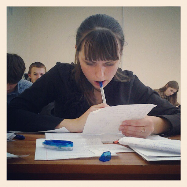 Девочка с синей ручкой во рту – хорошая. Из 105 человек первого курса меньше 20 закончили 1 семестр без долгов. Она – одна из них.