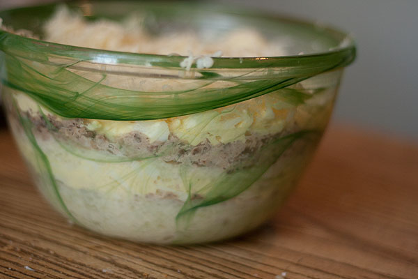 Слоеный салат “из того, что было” (картошка, яйцо, рыбная консерва, сыр, майонез).