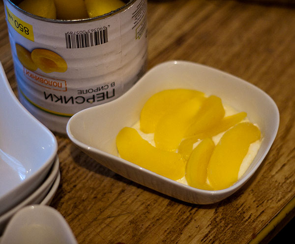 Для взрослых решила облагородить запеканку. Нет, не изюмом, как обычно, а персиками консервированными.