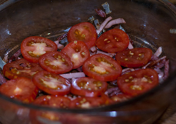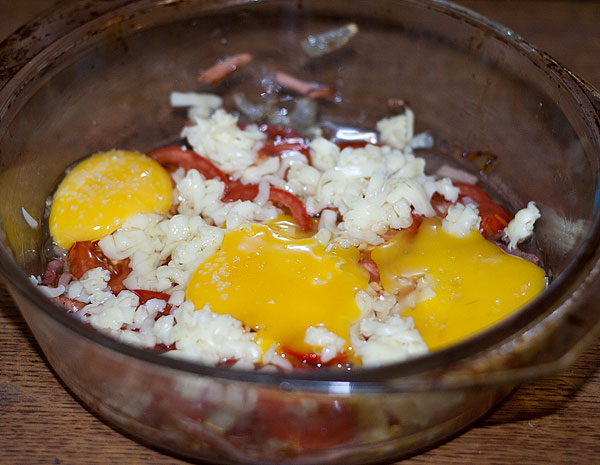 Все, что хочется в яичницу – в форму для духовки. Сверху яйца разбить и посолить.