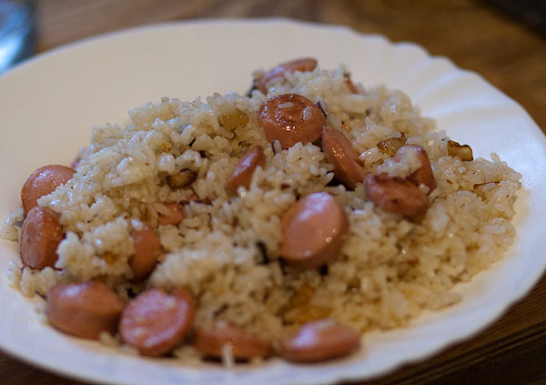 На картинке – с сосисками. Чаще всего делаю с куриной грудкой (она остается от курицы). Пару раз делала с грибами. Вобщем, что в доме есть, то и в ход.