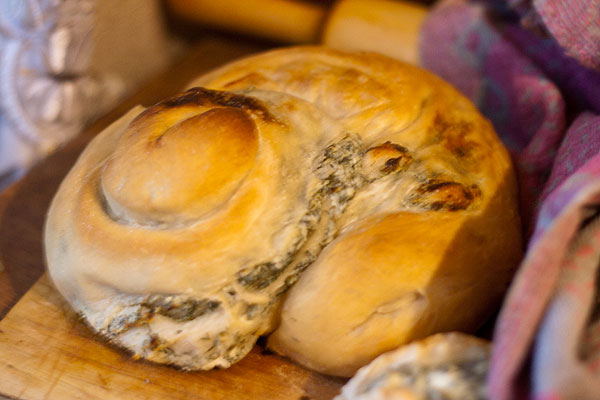 Тесто любое хлебное (у меня как на булочки). Начинка: сыр типа брынзы + много зелени + яйцо. Начинку хорошо смешать, размазать по тесту. Свернуть рулетом, рулет свернуть либо в узел, либо тоже рулетом. В горячую духовку.