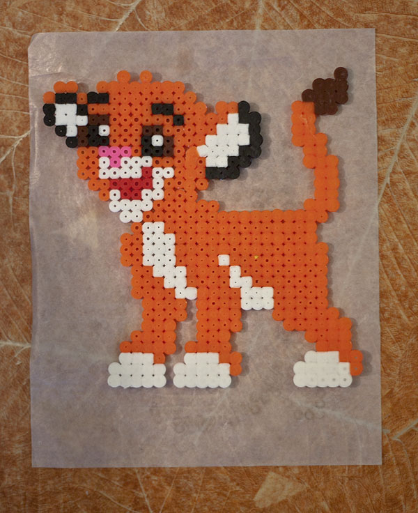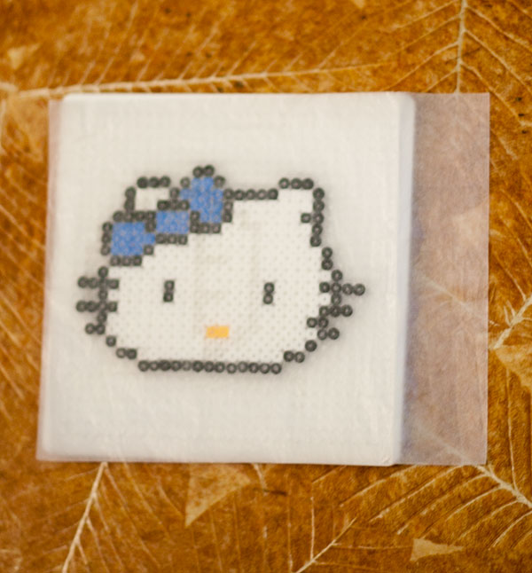 Вот кошечка прикрыта калькой для проглаживания. Чтобы бусины не прилипли к утюгу.