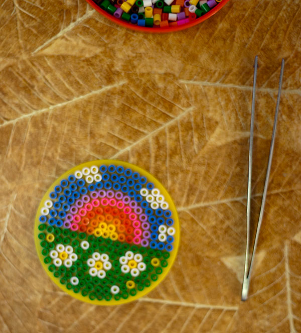Но потом оказалось, что эти бусинки надо накрыть калькой и прогладить утюгом. Бусины плавятся, склеиваются между собой в единый рисунок. Получается картинка-игрушка!