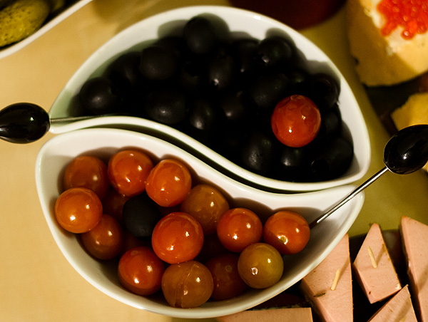 В оливнице красные – маленькие соленые помидорки.