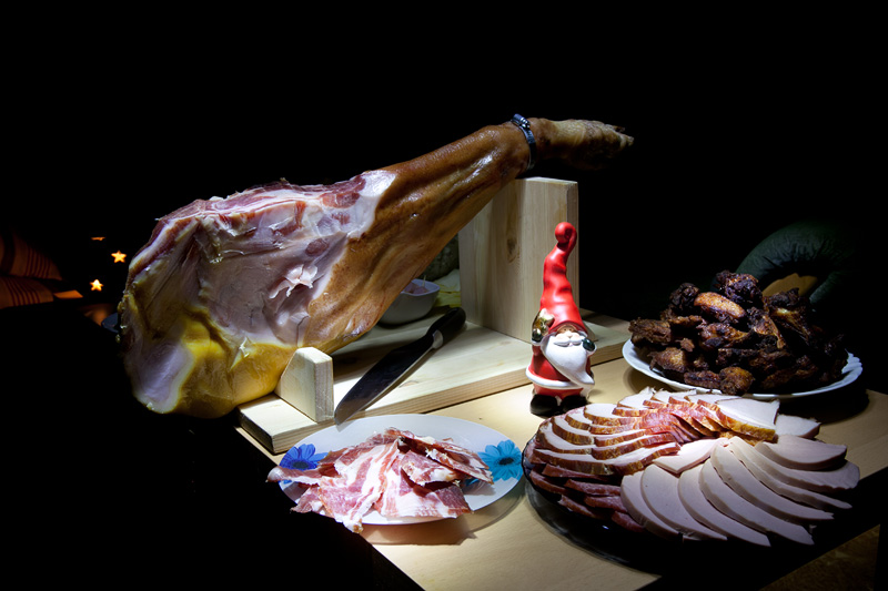 А еще на новогоднем столе у нас было мужнино детище – хамон. Муж (совместно с детьми) из подручных материалов даже сам хамонеру сделал.