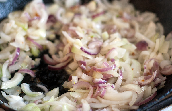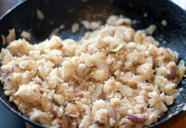 Когда лук стал мягким-мягким, чуть позолотился, вернула в сковородку рыбку и выключила огонь. Перемешала лук и рыбку. Посолила, поперчила черным перчиком.