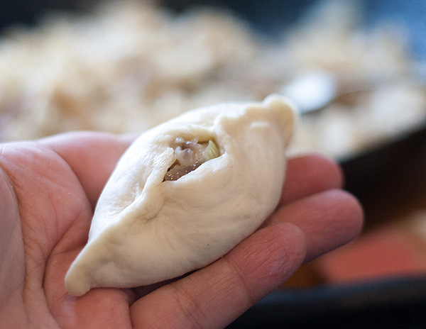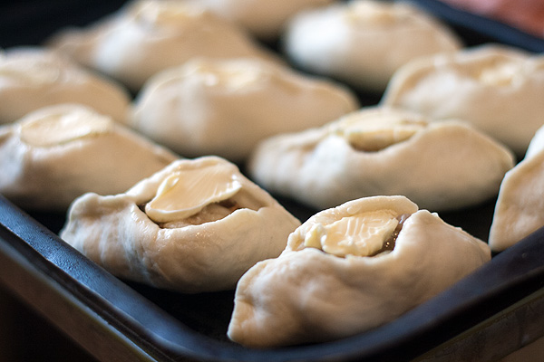 Из лепешек теста и ложки начинки лепим пирожки. Защипываем лодочкой.