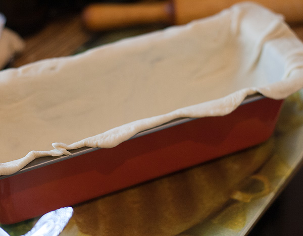 Тонкий пласт теста выложить в форму для хлеба, чтобы края свисали.