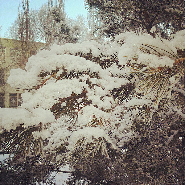 Снег во время морозов он же не липкий, на деревья не липнет. Когда тепло, снег липнет на деревьях и делает большую красивую шапку. А когда мороз так не бывает. Поэтому на деревьях в основном иней. И выглядит не так, как у вас. Но сугробы высокие, а все 3-полосные дороги стали 2-полосными. Самая правая полоса – выделенная для сугробов )))