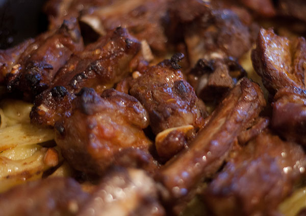 Свиные ребра: А еще у меня есть свиные ребрышки с картошкой. Ребра разрезать по одному. Замариновать. Равные части кетчупа острого, соевого соуса, соуса “экзотический” (с ананасами какими-то). Лучок колечками, чесночок дольками, пару ложек приправки, пару капель табаско. Оставить от часа до суток. На противень картошку порезать дольками, обвалять в растительном масле, чуть посолить. Сверху разложить ребра. В духовку до мягкой картошки.