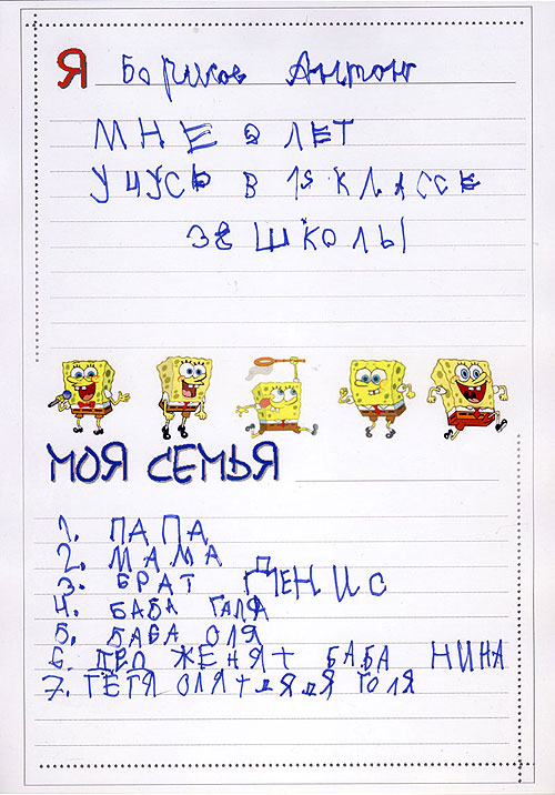 Анкетные данные. Распечатали дома, на ч.б. принтере. Имя-фамилия-отчетство ребенка и его родителей. Дата рождения, адрес проживания, телефоны для экстренной связи с родственниками.