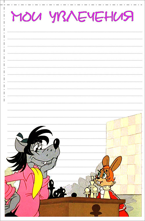 Денис (у которого тема “Ну, погоди!” как на картинке) из увлечений вспомнил только шахматы. Говорю: “А как же Лего? Ты же любишь Лего!” “Мама, но ведь Лего тут не нарисовано”.
