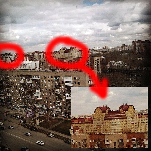 Это просто жилой дом. Углом он выходит на перекресток и угол скруглили. Вдалеке так же построено (тоже обвела).