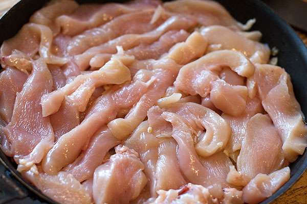 Индюшкино филе (можно курячье) порезать полосками толщиной до полусантиметра. У меня грамм 800.