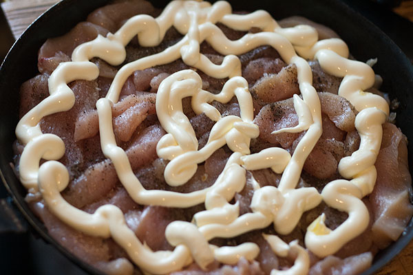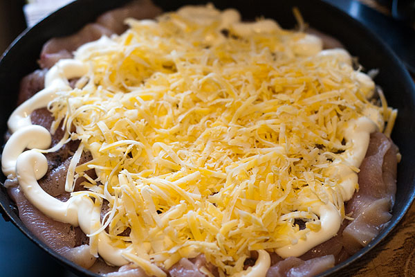 Посолить-поперчить. Полить майонезом. Вот примерное количество майонеза (мяса тут 2 слоя).