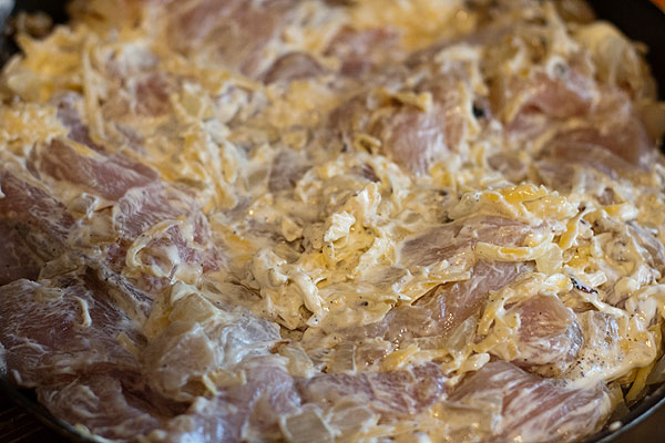 И оставить на пару часиков. Мясо в майонезе размякнет, промаринуется. Тут-то мы его и поставим на полчасика буквально в горячую духовку.