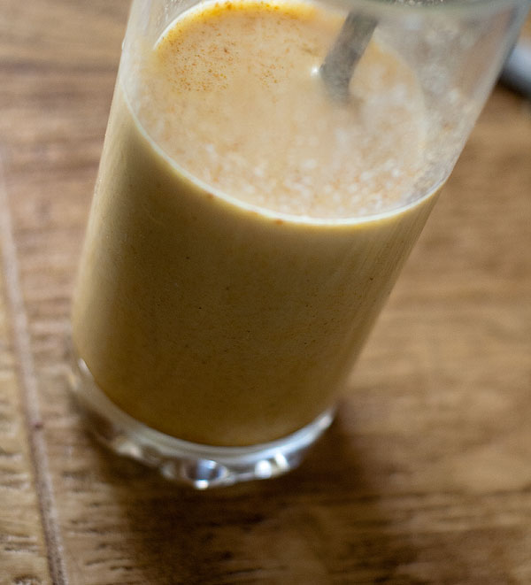 Если рис сварился раньше, чем вы возились с начинкой, можно его просто оставить на выключенной плите под крышкой, он даже лучше станет. Для риса готовим заливку. Полстакана молока и 1 яйцо разболтать. Чуть посолить (если рис несоленый вышел – посолить побольше). Добавить специи. Я добавила куркуму и кайенский перец для красивого цвета.
