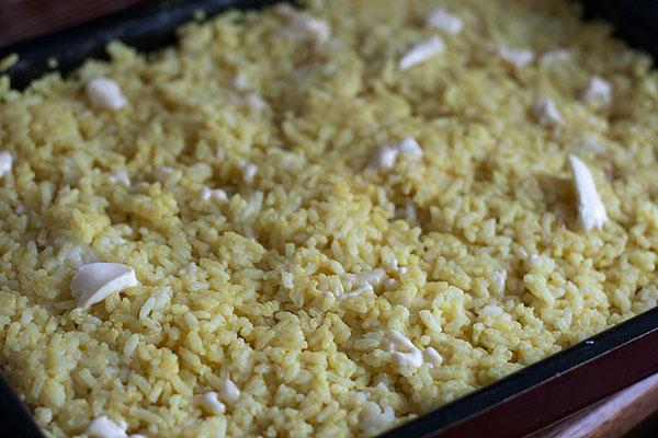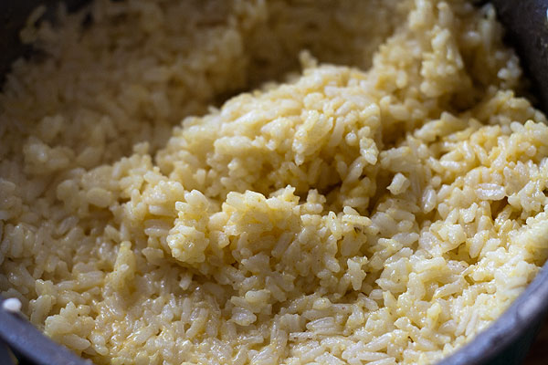 Смешала заливку с рисом. Рис действительно стал красивого цвета. И так легче следить, что весь рис хорошо пропитался заправкой. Непропитанные кусочки – белые.