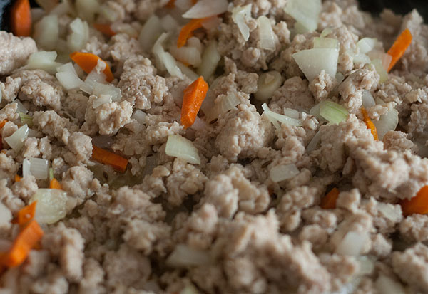 И ставим обжариваться на сковородке фарш. У меня куриный, но можно любой мясной фарш. Когда фарш схватится, добавляем к нему овощи. Обжариваем, пока овощи не станут мягкими. Посолить, добавить специи по вкусу. Фарша я взяла 800 грамм.