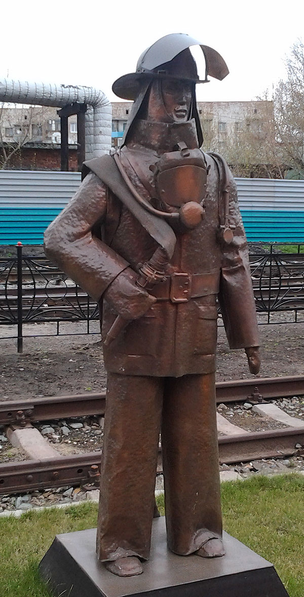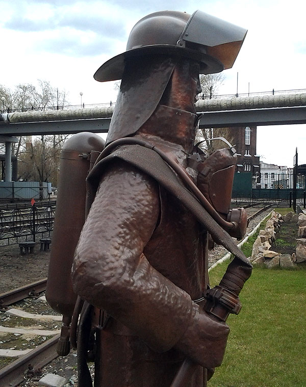 У Пожарного за спиной огнетушитель. Мне показалось, что приварили настоящий и раскрасили в цвет скульптуры.