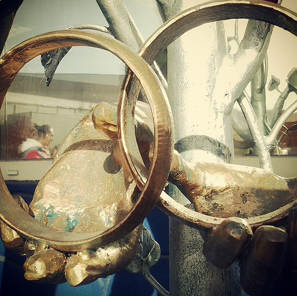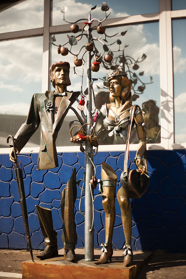 На мой взгляд скульптура “Свадьба” как раз не для брачующихся, а очень ироничная пародия на современную свадьбу, когда пьяная невеста со съехавшей на фатой курит, высунувшись из люка в лимузине. А должно быть обряд чистоты, любви и т.д. и т.п. Ну, я так эту скульптуру поняла по крайней мере.