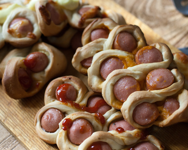 Про сосиски в тесте. В столовке стала встречаться такая вот красивая модификация сосисок в тесте. Сегодня делала своим -- Денис в восторге.