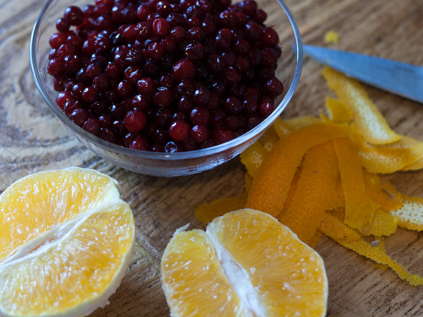 Стакан клюквы и 1–2 апельсина. От апельсинов я взяла цедру и мякоть. На фото апельсин один, в соус пошло полтора на этот объем клюквы.