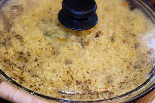Когда в рис полит кипяток и жир (общий объем жидкости = 2* объем сухого риса), сыпем туда специи и соль, включаем под рисом огонь, закрываем крышкой, готовим подобно плову или чему-то такому.