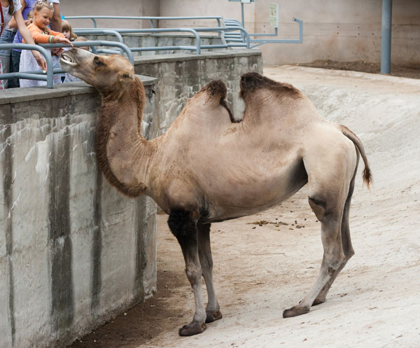 Верблюд выпрашивал лакомство. У нас лакомств не было, потому что мы вняли табличкам, что от неположенной еды животные болеют, зато нам удалось погладить верблюжачий нос. Правда, на снимке верблюжачий нос гладит посторонний ребенок.