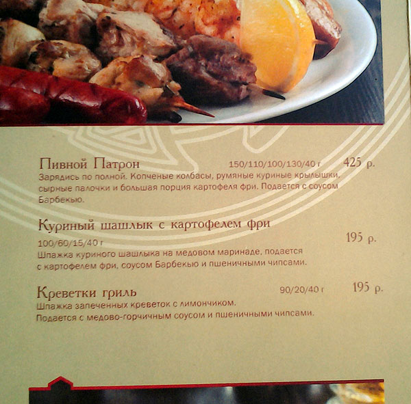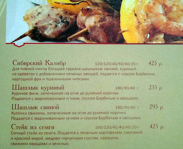 Возможно, вы перепутали с “Сибирским калибром”, например, по 425 рублей, но туда входит 3 шашлыка (свинина, курица и креветки) и еще всякие закусочные мелочи. А может, в мозгу сразу цена на двоих пересчиталась – у меня такое бывает, когда детям игрушки покупаю.