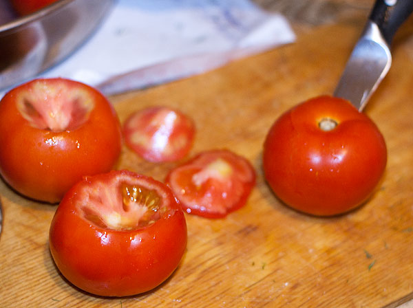 Много рецептов в интернете, где советуют удалить все помидорные внутрености. Фигня. Самое вкусное в результате – это как раз помидорные внутренности, которые мы не удалили! И сок с семенами, и “мясо”. Т.е. просто вырезаем вот такие конусы. Максимум, можете у помидорной крышечки срезать этот конус (и съесть!).