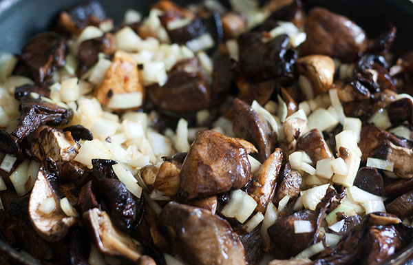 Лук и грибы – на сковородку и обжариваем вместе минут 10-15. Грибов у меня было 500 грамм.