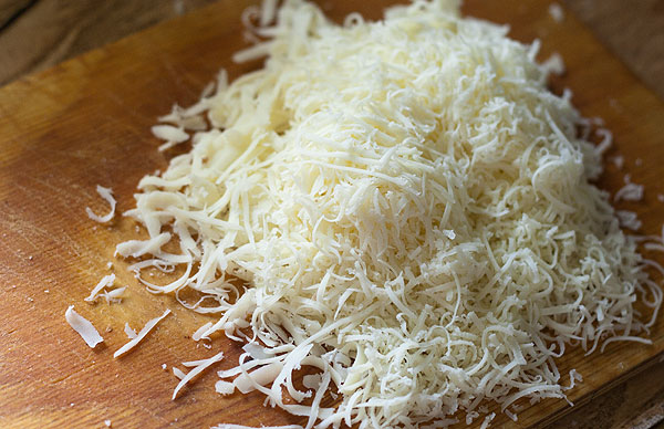 А пока грибы жарятся, режем грецкие орехи (грамм 100) помельче (не в крошку, но небольшими кусочками), трем на терке сыр. У меня 100 грамм моцарелы.